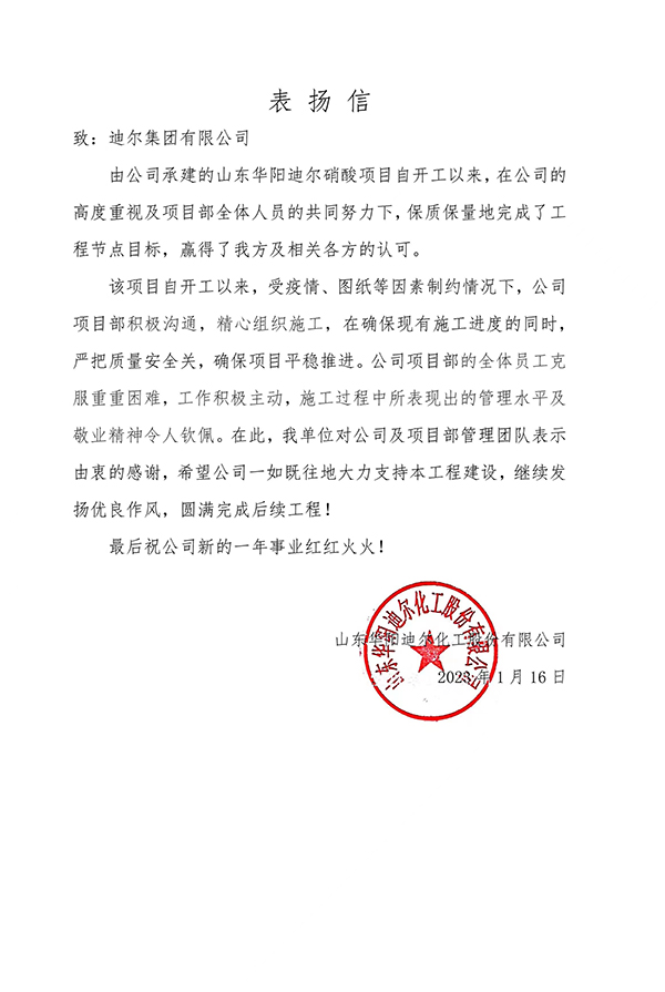 山東華陽迪爾硝酸裝置項(xiàng)目喜獲業(yè)主表揚(yáng)信