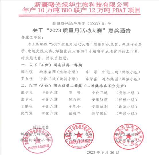 2023年9月30日下午,業(yè)主新疆曙光綠華生物科技有限公司聯(lián)合監(jiān)理安徽萬緯工程管理有限責任公司、總包東華工程科技股份有限公司及分包單位共同組織開展了“2023質(zhì)量月活動大賽”。