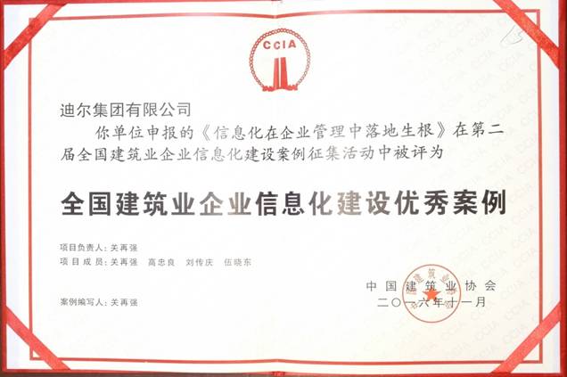 公司申報的《信息化在企業(yè)管理中落地生根》在第二屆全國建筑企業(yè)信息化建設(shè)案例征集活動中被評為:全國建筑企業(yè)信息化建設(shè)優(yōu)秀案例。