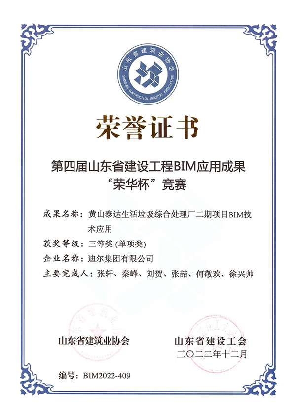 近日,由山東省建筑業(yè)協(xié)會、山東省建設(shè)工會聯(lián)合主辦的第四屆山東省建設(shè)工程BIM應(yīng)用成果“榮華杯”競賽結(jié)果評獎揭曉,迪爾集團有限公司經(jīng)專家評審、終評答辯和公示等環(huán)節(jié),最終獲得二等獎2項、三等獎2項的優(yōu)異成績